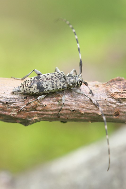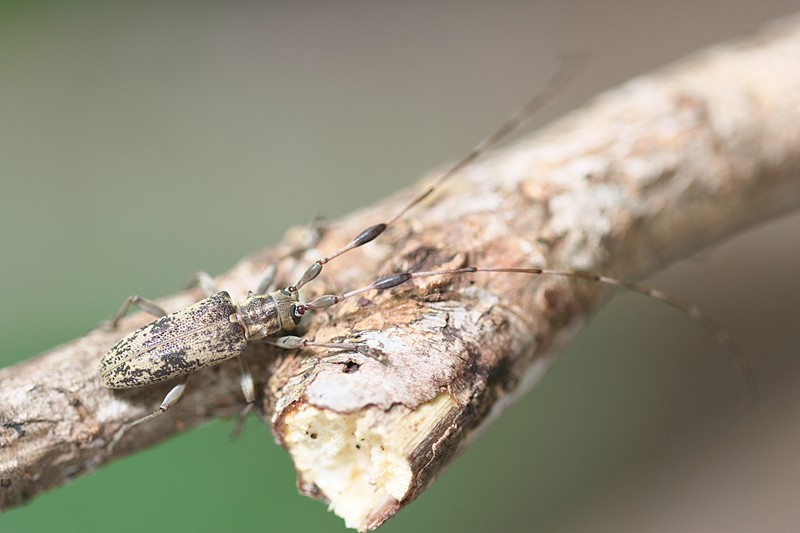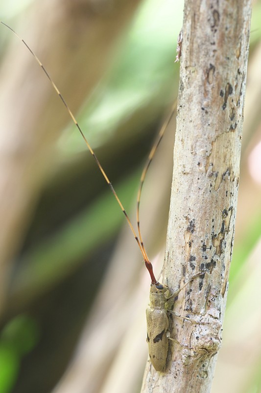 | 別の落ち枝で触角の長いカミキリムシを見つけた。セミスジコブヒゲカミキリのオスだと思いカメラの調子も悪いのであまり枚数は撮りませんでしたが、まさかの別種。最近地震で名前をよく聞くトカラ列島の名前が入ったイズトカラコブヒゲカミキリと判明。スルーしないでよかった。 | ||