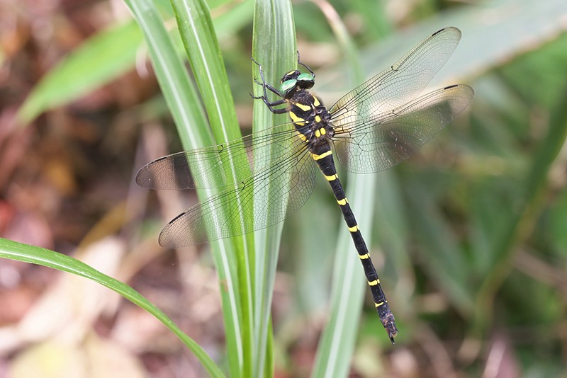 | 狭い登山道を数頭のオニヤンマが行ったり来たりしているのを見ていると、1頭が目の前のススキの葉にとまったので慌てて準備しましたが、このまま全然動かずゆっくり撮る事が出来ました。カメラにも虫よけでぶら下がっています。 | ||