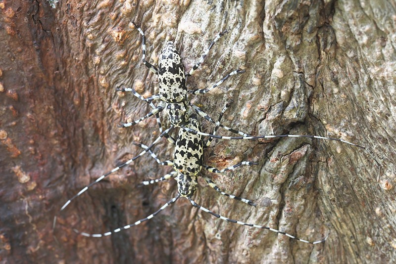 | 北海道3年目でようやく念願の野幌森林公園に行くことができた(一昨年は雨予報で予定変更。去年は雨予報で北海道行をキャンセルした為)。とにかく広くとても1日では回れない。新千歳空港では小雨が降っていたが野幌森林公園はドン曇りでなんとか散策はできる。散策を開始しましたが天気のせいかあまり昆虫の姿がないので一旦引き返して別ルートを進むことにした。広場のハンノキ(?)を見ると幹にヒゲナガゴマフカミキリがいた。青森で見つけてその翌年も探しに行ったが見つけられなかったカミキリムシ。2度目を北海道で見られたのは嬉しい。しこたま撮って視線を少し上にずらすとオスメスペアがいた。 | ||