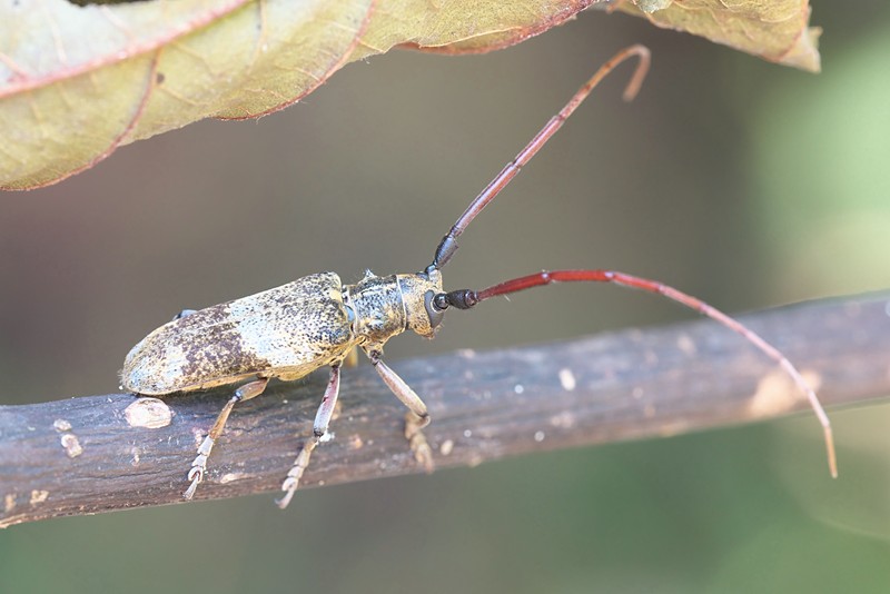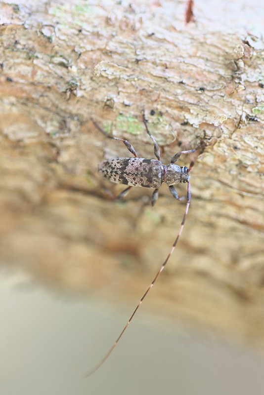 | 去年アオスジカミキリがいたネムノキがある場所まで移動し辺りを散策。枯れた松の枝で触角の長いカミキリムシを見つけた。枝の裏側にいたので上に出て来てもらおうとしたら落ちた。万が一に備えて下に手を添えていたのに一旦手に乗り地面に落ちてしまった。必死に探し落ち葉の上に乗っているのを見つけてホッとした。元の枝に戻したら物凄い速さで走って行き、手で阻止しようとしましたが追いつかず再び見失う。諦めずに枯れ枝を隈なく探し、なんとか見つけてようやく撮れました。レア種のナカバヤシモモブトが撮れた。 | ||