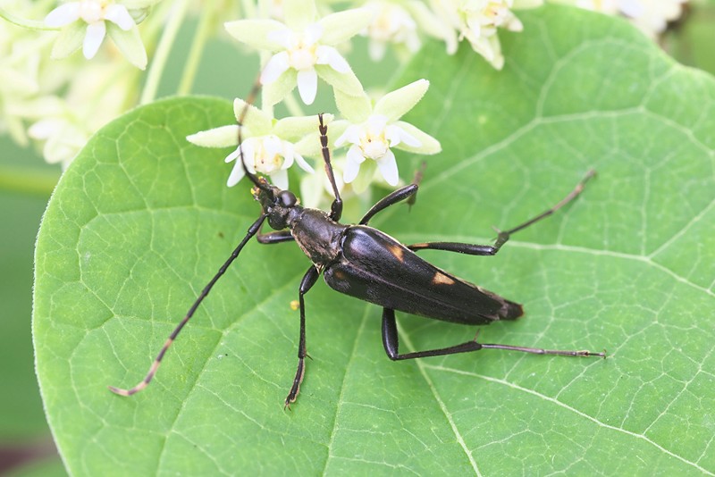 | 真夏にイケマが咲いていれば見つけない訳にはいかないカミキリムシですが、ほかのリンゴカミキリ同様すぐ逃げてしまう曲者。 | ||