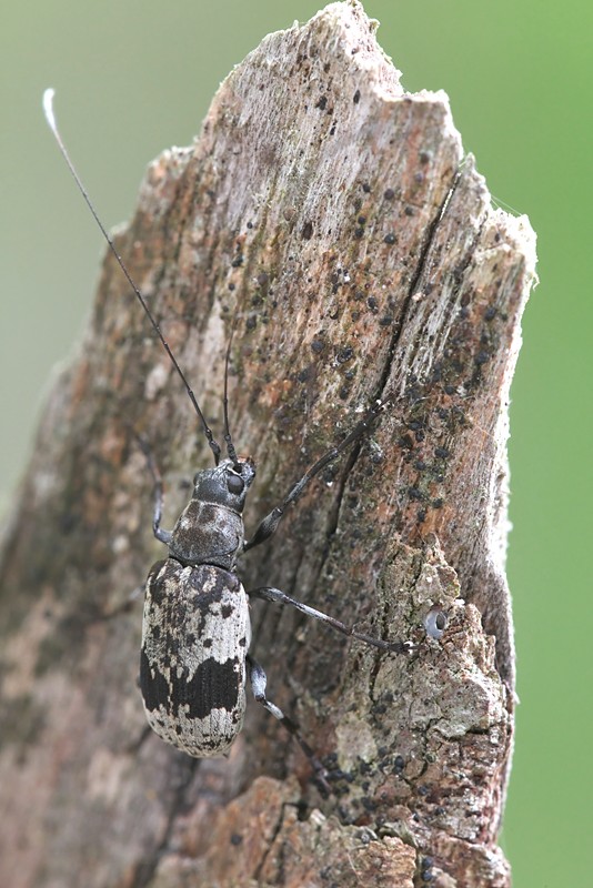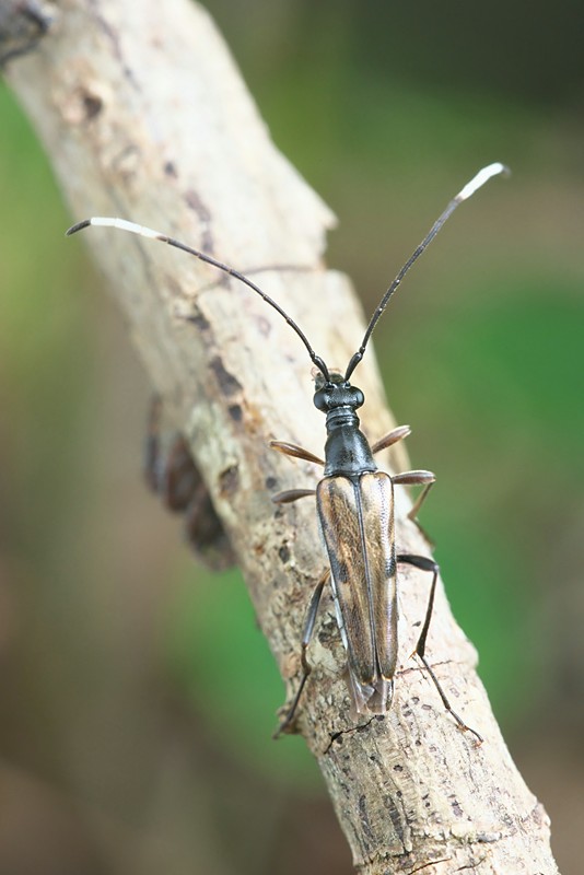 | 去年アオスジカミキリがいたネムノキがある場所まで移動し辺りを散策。枯れた松の枝で触角の長いカミキリムシを見つけた。枝の裏側にいたので上に出て来てもらおうとしたら落ちた。万が一に備えて下に手を添えていたのに一旦手に乗り地面に落ちてしまった。必死に探し落ち葉の上に乗っているのを見つけてホッとした。元の枝に戻したら物凄い速さで走って行き、手で阻止しようとしましたが追いつかず再び見失う。諦めずに枯れ枝を隈なく探し、なんとか見つけてようやく撮れました。レア種のナカバヤシモモブトが撮れた。 | ||