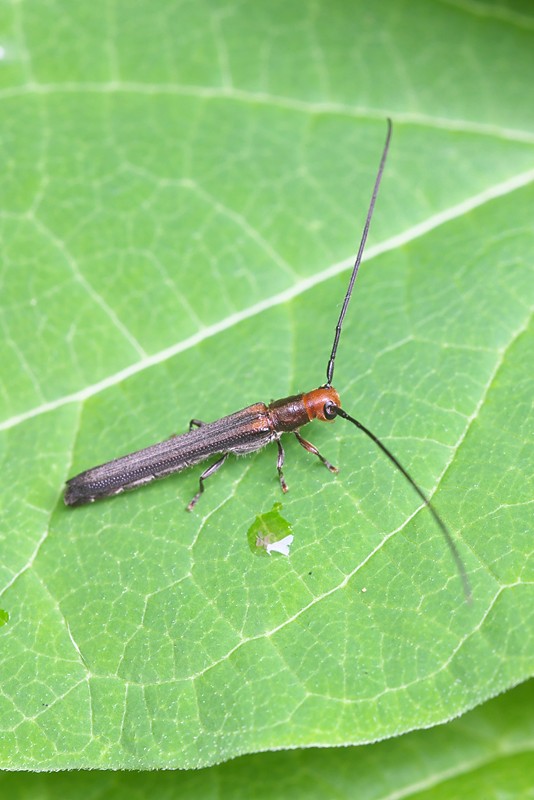 | 標高の高い所に生息する全身黒いハナカミキリ。この場所は1500mぐらいです。4年前に撮ったのがオスでしたから今回はメスを載せます。この日はオスも撮れました。後ろ脚の2番目の節(脛節)が湾曲している(上のハナカミキリ類と比べても)のが特徴です。ちなみに4年前に載せた時(2021/08/14号)もフタスジハナ、マルガタハナカミキリと一緒に掲載していました。 | ||