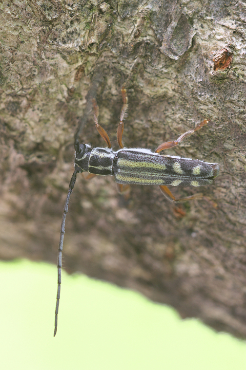 黒に黄色の紋がある美麗なカミキリムシ。メスの模様は黄色っぽいですが、オスは白っぽくなります。