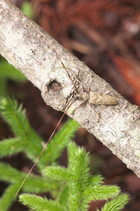 ニセビロウドカミキリは頭部にも点刻があり、近縁の