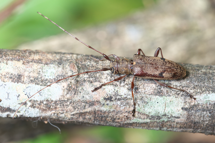 翅端が斜めに切り込まず丸くなっている。上翅中央付近に一対の黒い紋がある。オスの触角の第3節はコブ状に膨らむ。東日本ではレア種。