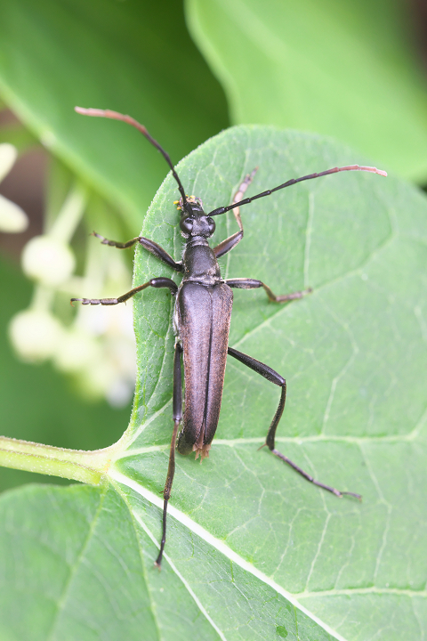 標高の高い所に生息する全身が黒いハナカミキリ。オスは前胸の長い毛が密にある。後脛節(後ろ脚の2番目の節)が近縁種より湾曲している。